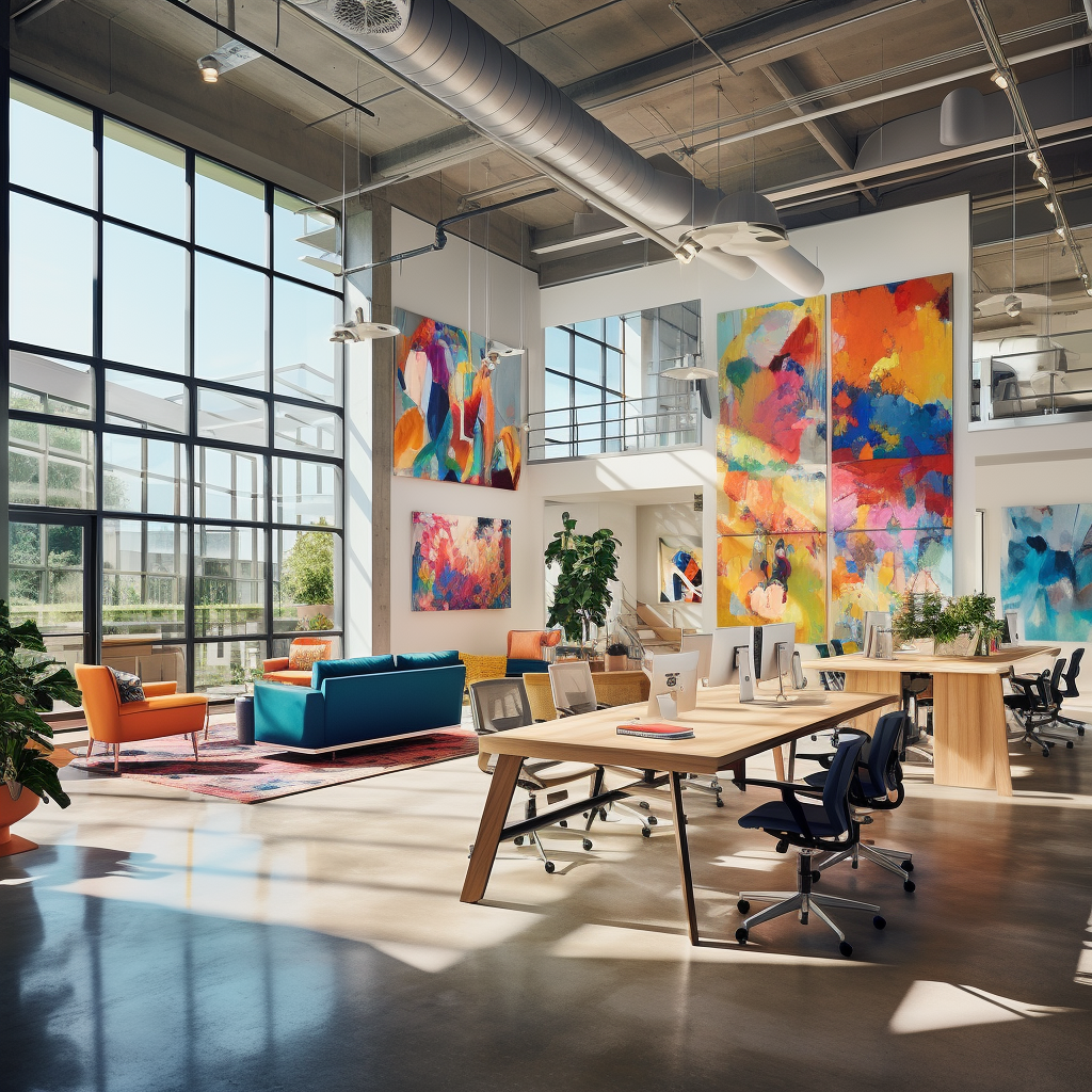 ”a vibrant and bustling creative working area within a modern company. The space is filled with natural light streaming through large, floor-to-ceiling windows. The walls are adorned with colorful, inspirational artwork. There's a mix of open, collaborative workstations and cozy, nooks with comfortable seating for focused work. The center of the room hosts a communal worktable, where team members gather for lively discussions and collaboration.”