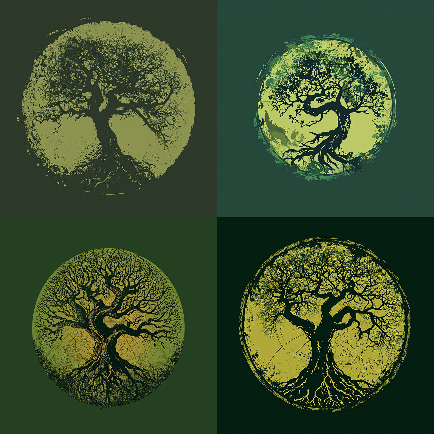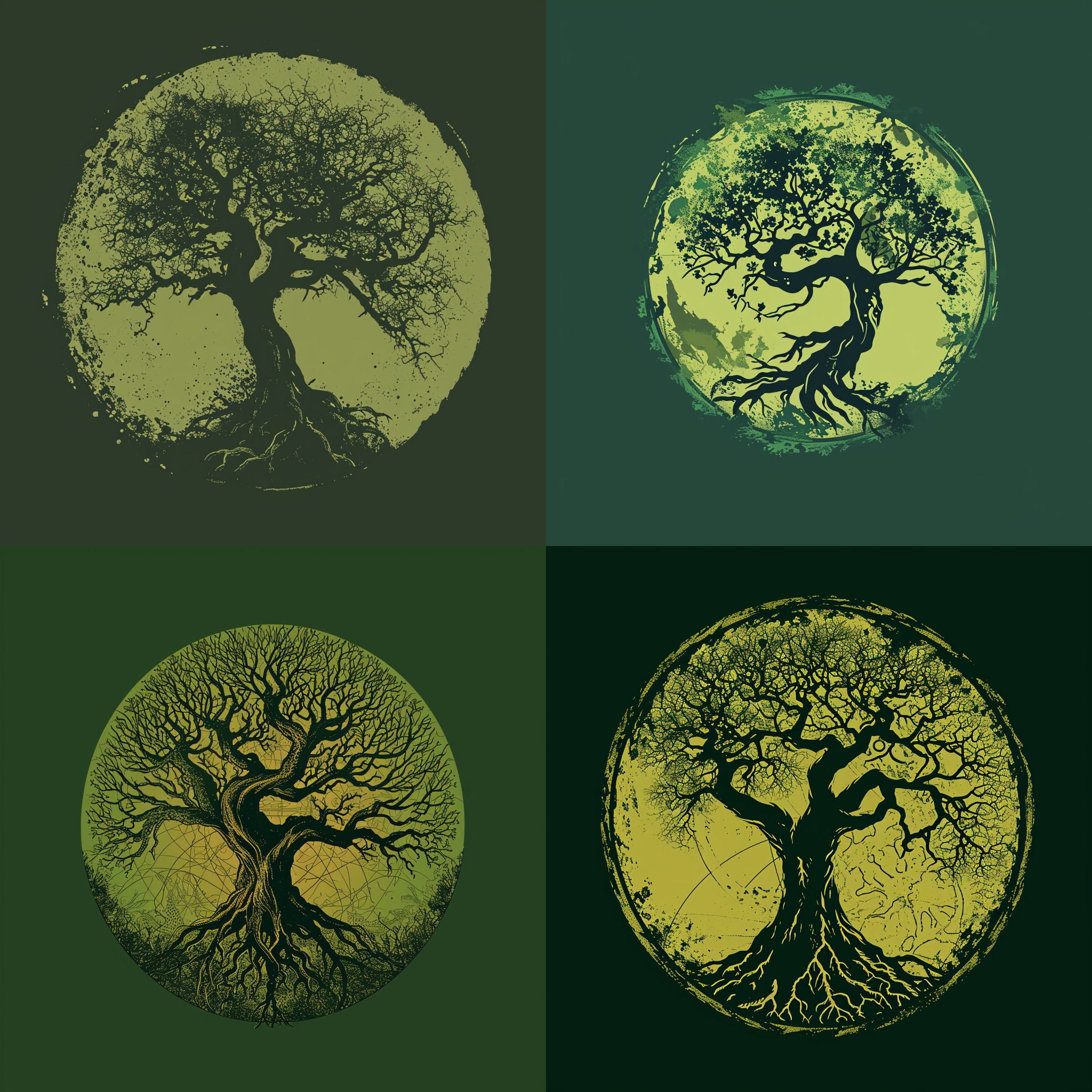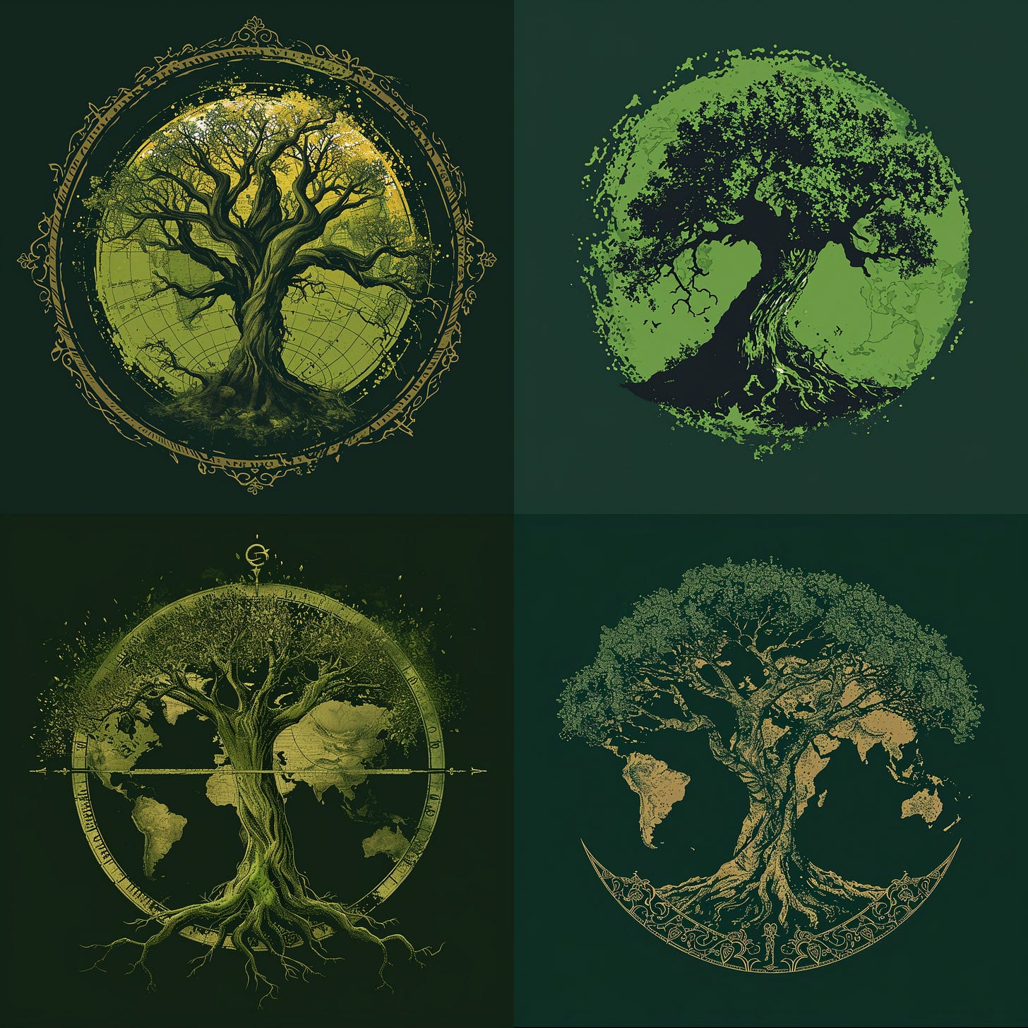 /imagine A logo in rich green colors. At the center of the design is a large old tree whose branches transform into a world map. --v 6.0